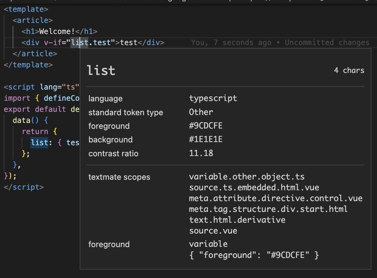 - 이때, 내가 수정하고 싶은 부분이 어떤 scope인지 알기 위해서 F1(ctrl+shift+p) > inspect editor tokens and scopes를 클릭해서 아래 사진 같이 나오는 걸 확인 후, textmeta scopes에 적혀있는 값을 하나 적어주면 됩니다.
