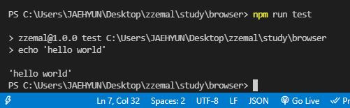 실제 위의 package.json이 있는 위치에서 터미널로 npm run test를 실행하면 echo 'hello world' 가 정상 동작하는 것을 확인 할 수 있다.